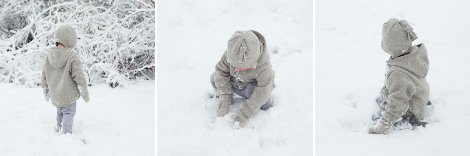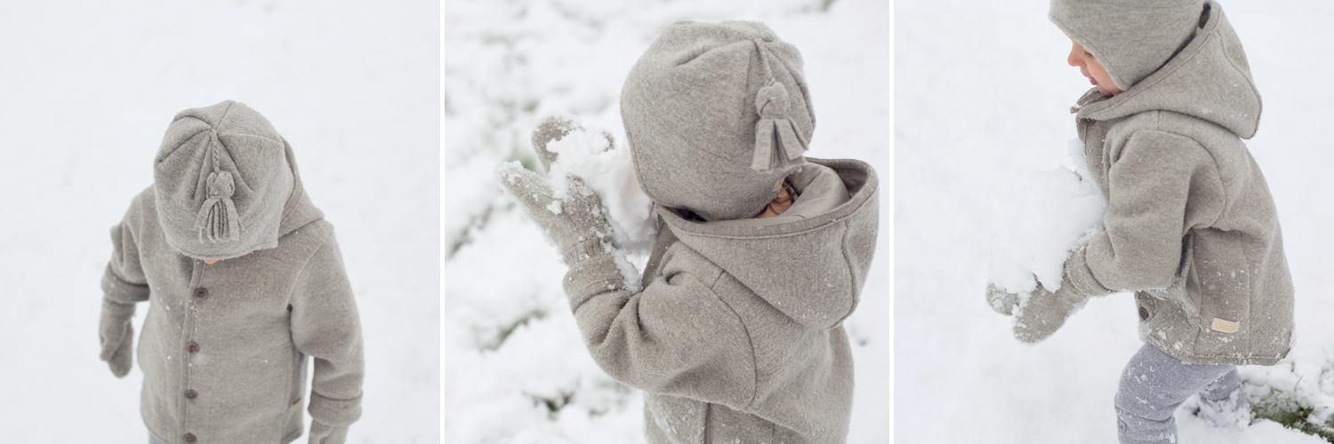 COMFORT: I wasn’t sure how rough or thick this jacket would be as I had no prior experience with boiled wool. I was very pleased with the softness, and it is thin enough that it can be used safely with a car seat. The neck and hood area is lined with matching organic cotton so the wool is never directly against the skin. Boiled wool is almost entirely windproof while balancing hot and cold temperatures, and it transitioned very well from cold outdoors to warm buildings.